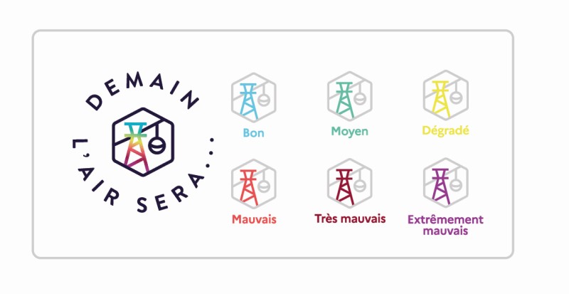 L'indice Atmo (de bleu à magenta) indique aux habitants la qualité de l'air prévue le lendemain sur la ville (de bon à extrêmement mauvais). Cet indice est défini par l'État en concertation avec les associations agréées pour la surveillance de la qualité de l'air.