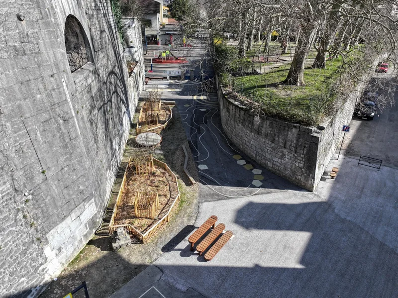 Le site, se situe à proximité de la porte Saint-Laurent et des remparts. Aussi, le projet d’aménagement a bénéficié d’une attention particulière en raison de son importance patrimoniale. Les travaux, menés à l’hiver 2025/2026 ont permis de piétonnier le passage sous la porte Saint-Laurent, très fréquenté par les enfants et d’améliorer la sécurité piétonne jusque devant la Maison pour tous.