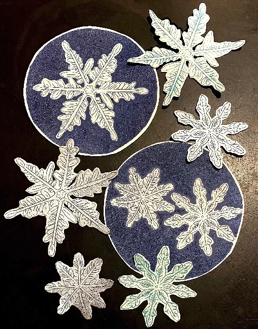 Vous graverez et imprimerez à la presse les flocons de neige de votre choix, grâce à des modèles inspirés de véritables photos macro. Cadre surprise en linogravure.