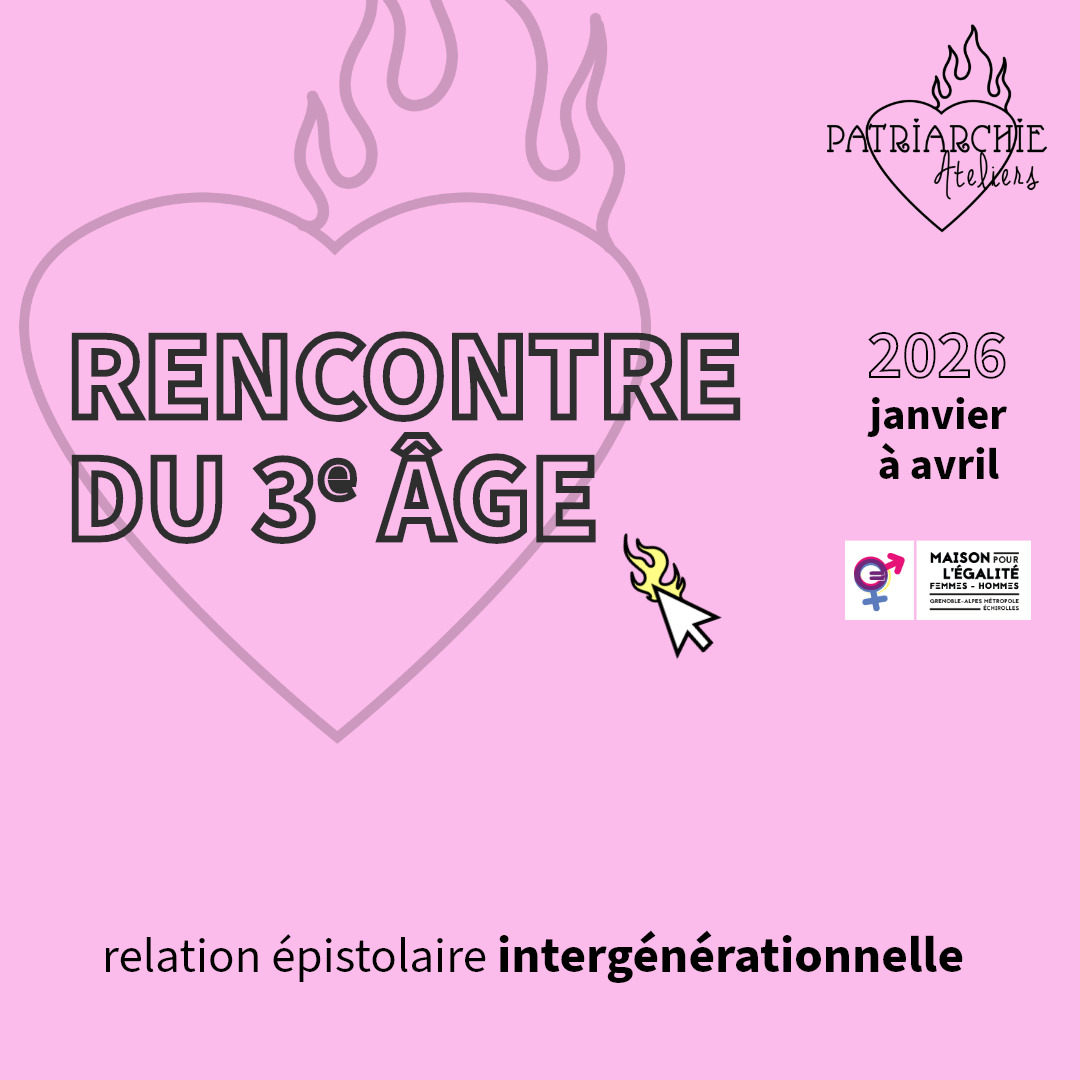 Un cycle d’écriture intergénérationnel féministe pour créer du lien entre femmes de générations différentes. Patriarchie invite 10 femmes (-27 ans) et 10 femmes (+67 ans) à entretenir une relation épistolaire anonyme pendant 3 mois, autour de leurs expériences. Une restitution avec expo et lectures est prévue en mai.