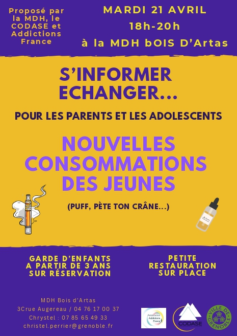 Conférence à destination des parents et des adolescents pour s'informer, échanger autour des nouvelles consommations des jeunes (puff, pête ton crâne, proto...).