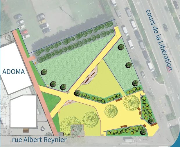Situé à l’angle de la rue Albert Reynier et du cours de la Libération, cet îlot de fraîcheur et espace de détente prévoit :
